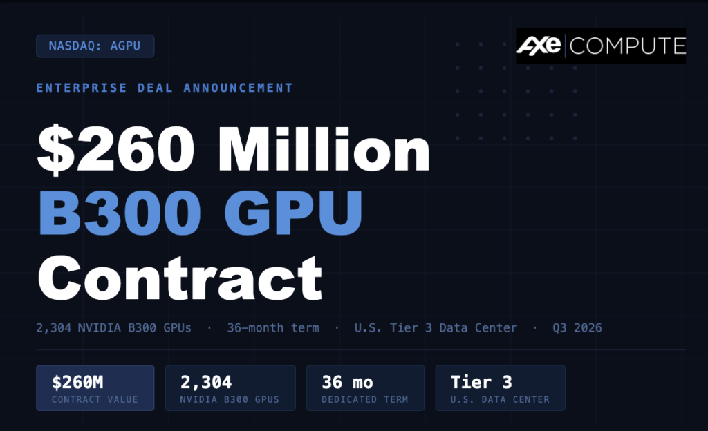 Axe Compute (NASDAQ: AGPU) has signed a $260 million, 36-month enterprise contract to deploy a dedicated cluster of 2,304 NVIDIA B300 GPUs and AI-focused high-speed storage in a U.S. Tier 3 data center. It is the largest enterprise engagement in the company’s history since entering the compute business.